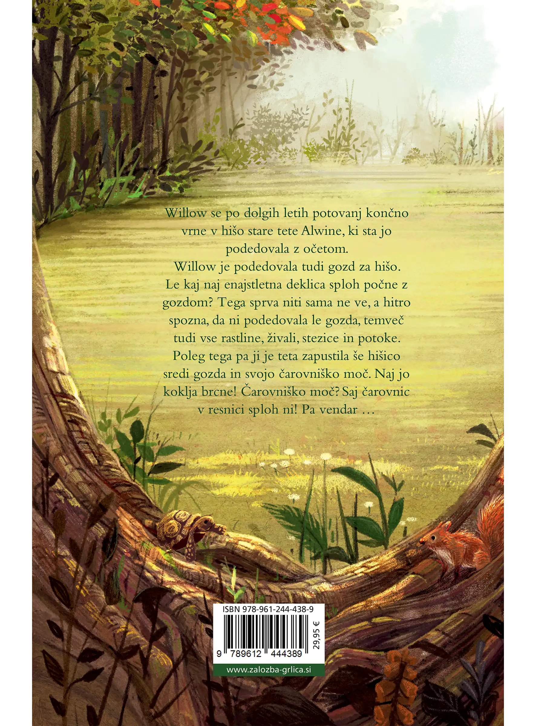 Willow je podedovala tudi gozd za hišo. Le kaj naj enajstletna deklica sploh počne z gozdom? Tega sprva niti sama ne ve, a hitro spozna, da ni podedovala le gozda, temveč tudi vse rastline, živali, stezice in potoke. Poleg tega pa ji je teta zapustila še hišico sredi gozda in svojo čarovniško moč. Naj jo koklja brcne! Čarovniško moč? Saj čarovnic v resnici sploh ni! Pa vendar …