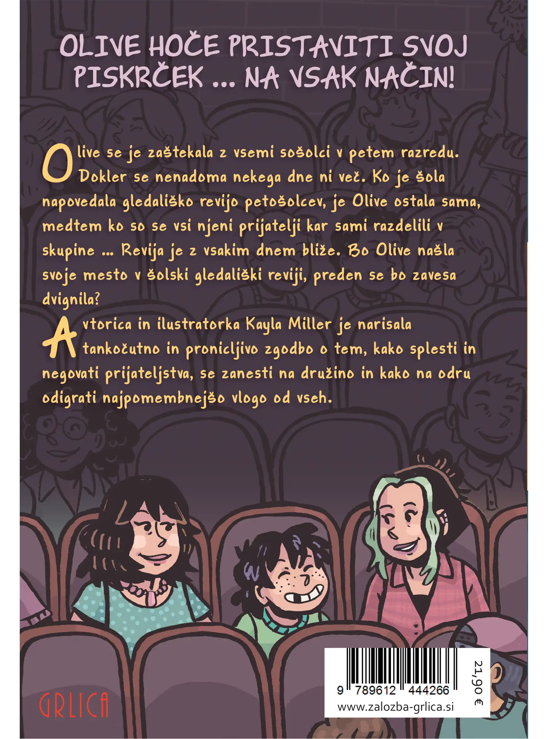 Avtorica in ilustratorka Kayla Miller je narisala tankočutno in pronicljivo zgodbo o tem, kako splesti in negovati prijateljstva, se zanesti na družino in kako na odru odigrati najpomembnejšo vlogo od vseh.
